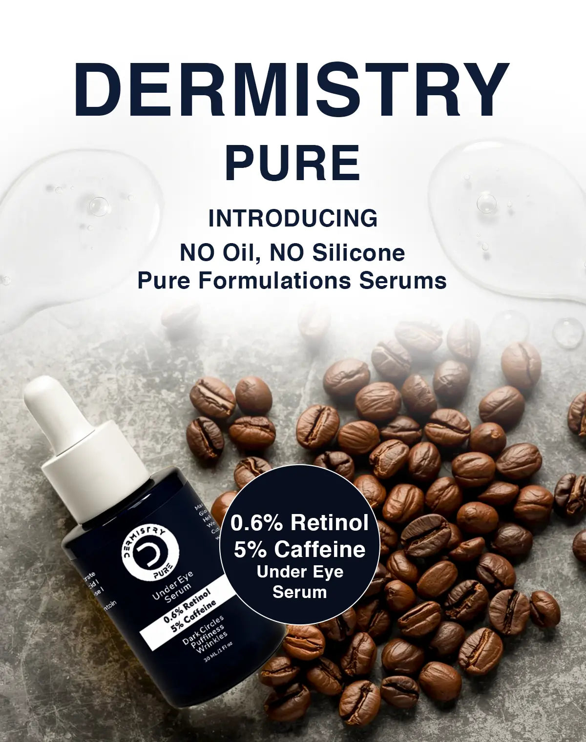 0.6% Retinol and 5% Caffeine under-eye serum reduces lines, dark circles, puffiness, firms, hydrates, suits all skin types day-night.